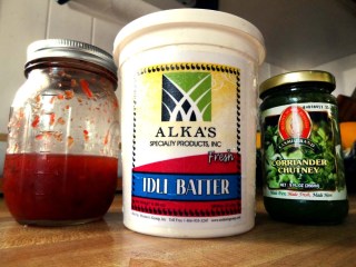 Ryan says that idli is usually eaten simply with a chutney, but since I had leftover potato curry, I served it up as well as the chutneys, which turned out to be delicious.