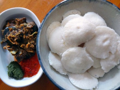 Idli (English pronunciation: /ˈɪdliː/, also romanized “idly” or “iddly”, plural “idlis”; Kannada: ಇಡ್ಲಿ; Malayalam: ഇഡ്ഡലി; Tulu: ಇಡ್ಲಿ; Tamil: இட்லி; Telugu: ఇడ్లీ, ఆవిరికుడుము (Aviri-Kudumu)) is a savory cake of south Indian origin popular throughout India. The cakes are usually two to three inches in diameter and are made by steaming a batter consisting of fermented black lentils (de-husked) and rice. The fermentation process breaks down the starches so that they are more readily metabolized by the body.