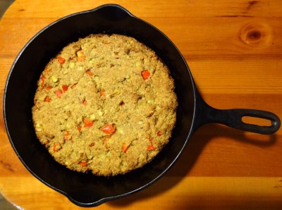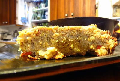 I really like the way this bread tastes. I like the texture; it has a good crumb and holds together well. The kernels of corn and bits of red pepper add bursts of juiciness and flavor. Sugar and olive oil give it complexity. Polenta is coarser than regular cornmeal, lending this bread a rustic quality. If you’d like to make it vegan, I would venture to guess that it would be fine without the egg, as there is ground flax meal to bind it together.