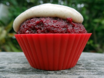 I have been hankering to make these for a while. When I sat down to look at what others have thought of in the cupcake-colored-by-beets department I was not surprised to find that there are dozens of recipes out there on the myriad of food blogs. I was most inspired by this blog: My Diverse Kitchen. Nearly all the recipes out there either call for roasted or steamed or canned beets. I am TOO lazy to roast or steam if I think it unnecessary, so I simply pureed the beets along with the other liquid ingredients and it worked out just fine. Think of this as a naturally colored red velvet cake. The beet flavor is present but not overwhelming, and the texture is moist and slightly dense. The lemon and the small amount of cocoa powder compliment the beets in a wonderful, refreshing way. Best of all is the stunning color.