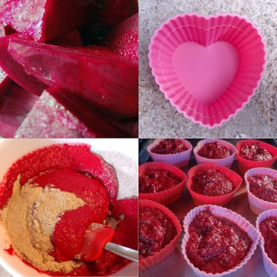 In a blender combine the beets through the egg and puree until very smooth. In a mixing bowl combine the flax meal through the salt. Add the beet mixture and stir to mix. Fill cupcake molds 3/4 full (these rise gorgeously). Bake for 20-30 minutes, depending on cupcake size.