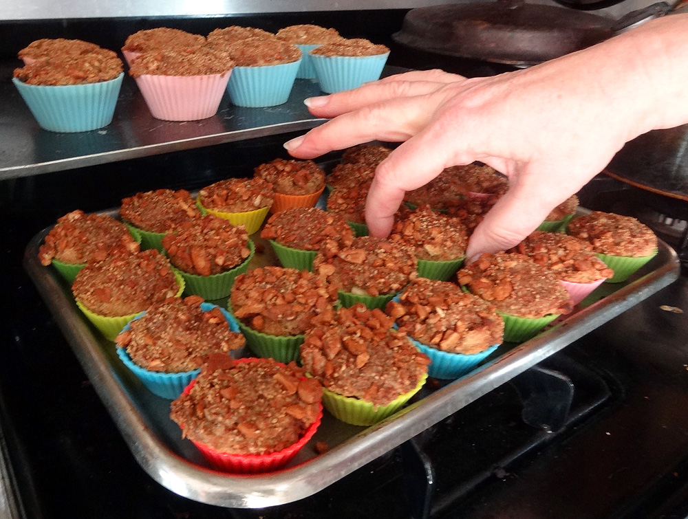 Here is another tasty addition to the-muffins-made-using-almond-pulp (and a buncha other stuff) collection…And they’re vegan to boot! I was a vegan for a long time and I have decided to post more recipes without eggs for my vegan readers. (Know, too, that you can usually omit the eggs in these recipes, as the flax and chia are great binders on their own). One of the only baked goods I make that absolutely must have the eggs is the Amazing Chocolate Cake.