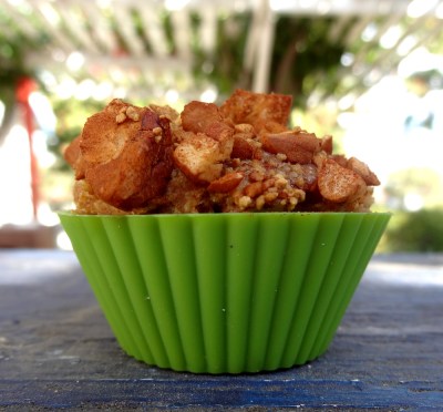 Scoop muffin batter into muffin tins or if you have them, silicone muffin molds. Dip each muffin into the topping or sprinkle over the top if using tins.
