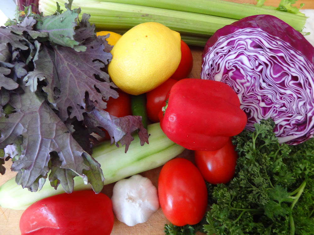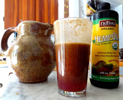 Process through a juicer, adding the tamari and hemp seed oil at the end. If you don’t have a juicer, use a blender and a paint straining bag. Start with the juicy vegetables (tomato, cucumber, lemon). Puree and strain the liquid using the bag as you would make almond milk. Pour the liquid back into the blender and add the rest of the vegetables. Blend well, restrain and add the tamari and hemp seed oil if using.