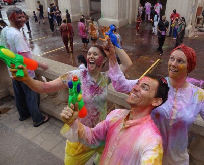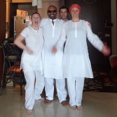 Of course, India is not just about the food. There is so much to take in here, like a sensory overload. In addition to big flavors, there are big colors, big smells (good and bad), big sounds. Our color and sound sensory input were turned up to 11 on our second day here at the holi festival, or festival of color. Marking the change of the season, this is the holiday in which people blast each other with colored powders and water, basically a big water balloon fight on the streets. In the olden days it was believed that during the change of the season it was prudent to throw around medicinal colors to help ward off sickness. Neem, turmeric and other natural powders were smeared and tossed around in a communal inoculation of brilliant hues. These days the colors are synthetic dyes that can stain the skin and hair for days. I was encouraged by my friend who we are staying with to douse my blond hair with coconut oil and then cover it up. That of course, did not stop her husband Vijay or Ryan from wrestling my scarf off my head and then dousing my hair with colored water and powders. Fortunately, the coconut oil did the trick and I am still looking natural. A few days of pink hair would be fine but Jill reported that one year her hair stayed colored for months.