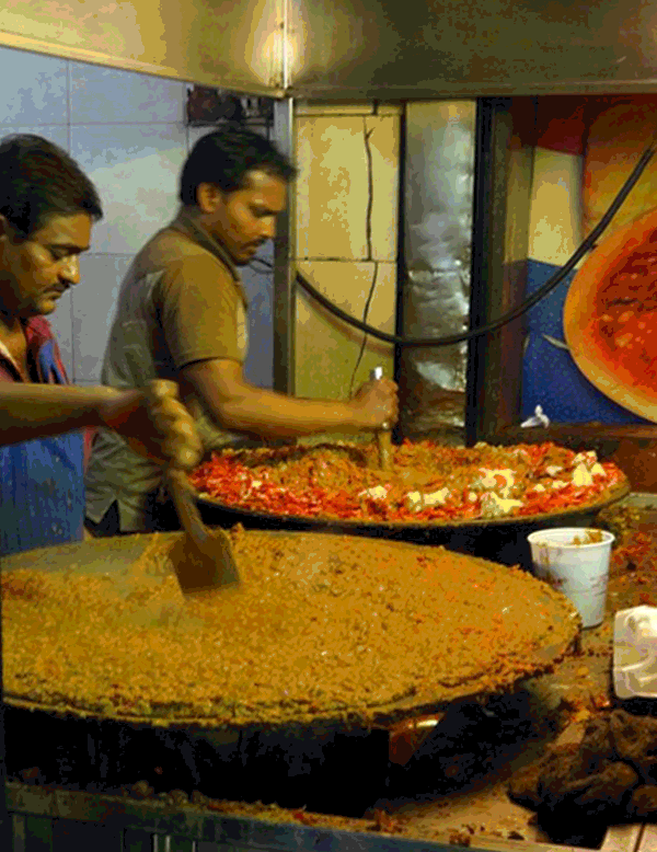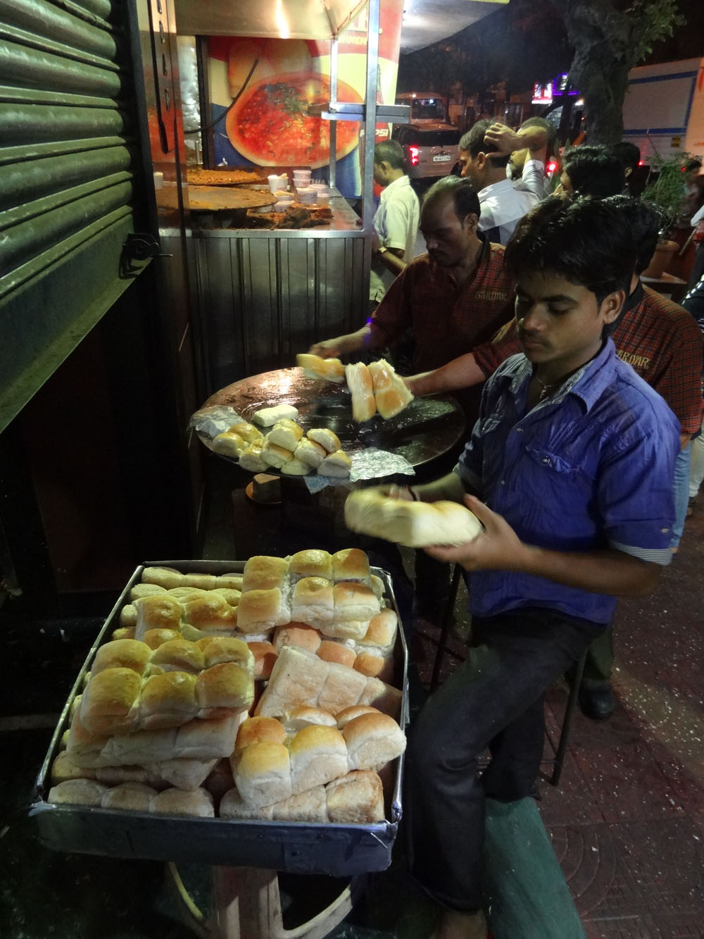 Serving up only one thing, Sardar is in the business of selling pav bhaji not only to the sit down clientele but also to an endless stream of to-go customers on foot and in car, which does not let up until closing time at 2am. It was fascinating to watch the cooks mashing up huge pans of butter, spices and vegetables into the famous red colored curry that we would be sopping up with hot, buttery rolls. The sheer volume of food that this place churns out is formidable, ensuring fresh, delicious fare from opening time until closing.