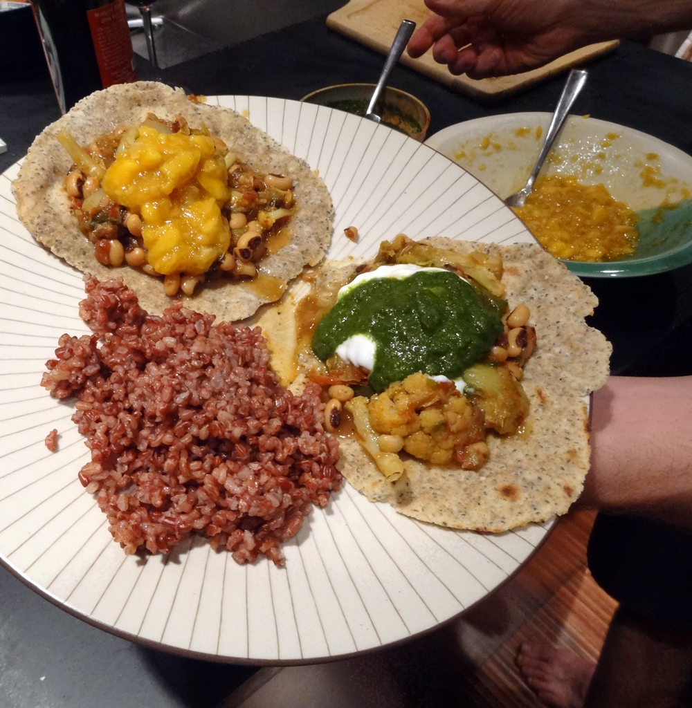 When I planned to make this meal, I didn’t even realize that I was making a GF version of Camel Safari Masala, until Ryan pointed it out to me. I made a masala with brussels sprouts, black eyed peas, and cauliflower florets. It was tasty alongside cilantro chutney, raw mango chutney and fresh plain yogurt.