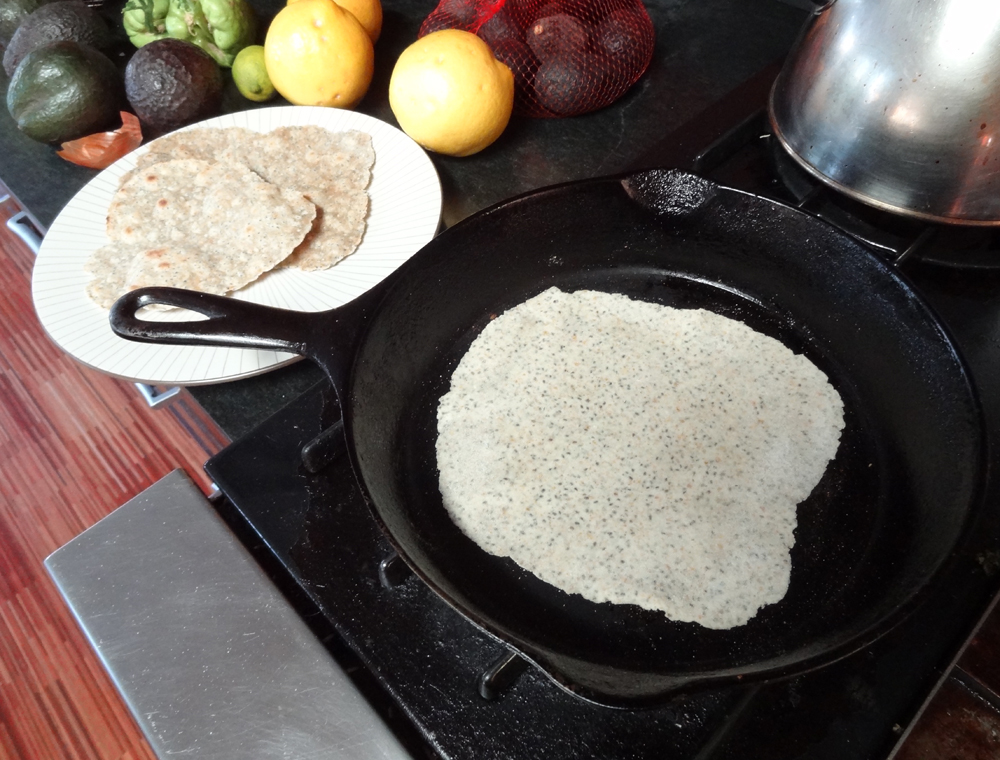 These flatbreads are a slightly pliable but not quite as soft as wheat based chapatti or roti (which are basically the same thing). The rice flour results in a slightly drier, crispier bread that is less heavy than its wheat-based relative. They are speckled throughout with chia seeds. They are perfect for conveying morsels of the masala over to the mouth region. I did not use a recipe per-say, but I will walk you through the process so you can enjoy them at home.