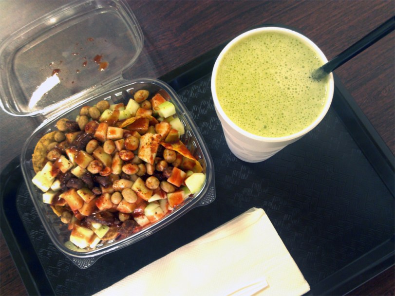 We had the green juice, with fresh pineapple, celery, parsley, grapefruit, nopales, spinach and orange juices all in one glass. We also enjoyed tostilocos minus the cueritos (pork skin). This snack is a hodge podge of jicama, pepino, chaka chaka (?), cacahuate (peanuts), tajin (one of my mom’s favorites), lemon, chile, and chamoy. It was cruncy, salty, tangy and spicy. There were salty round corn chips tucked throughout the mix as well.