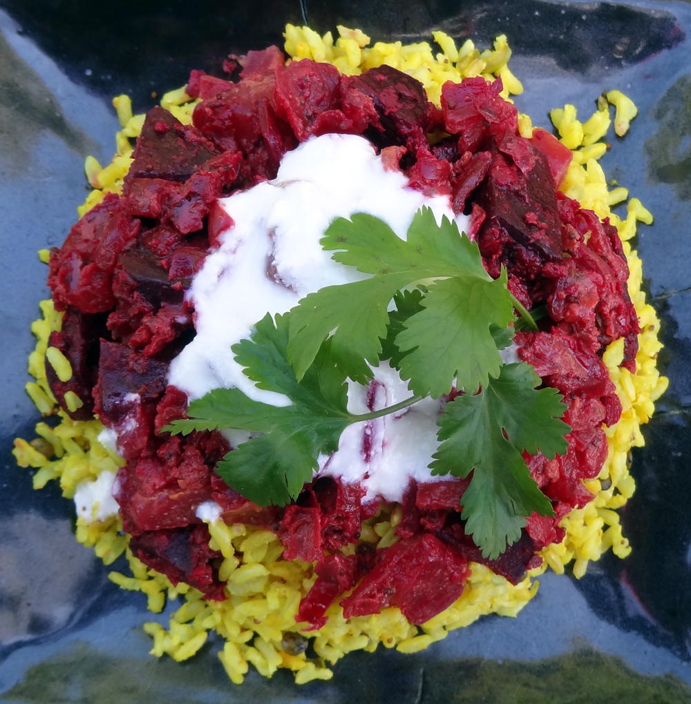 In a large wok, heat the oil. Add the mustard and cumin seeds and allow them to brown and begin popping. Add the onion, turmeric and hot peppers. Then add the beets and stir will. Add the besan, sprinkle with a couple of tablespoons water and continue cooking and stirring until the raw flavor of the besan goes away. Salt to taste.For a groovy dome-shaped service, choose a round bowl of your preferred serving size. Fill the bottom third with beet curry and the rest with lemon rice. Press down firmly, put a small plate on top and flip over. Carefully remove the bowl, and top with plain yogurt and chopped cilantro. Bon appétit!