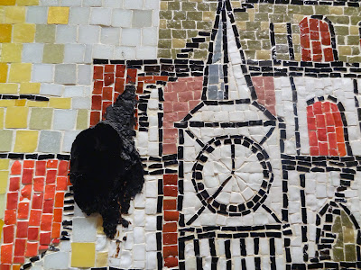 And this is a picture of the young Joe Young, working with a hammer and hardie. The mosaic I am restoring is smalti and glass tile. It depicts monuments of Europe, including Big Ben, the Eiffel Tower and what looks like the Colosseum.