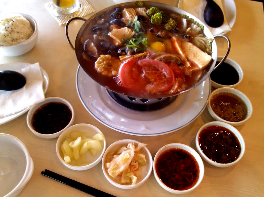 This is a shoutout to the new eatery inside the 99 ranch complex on Clairemont Mesa in San Diego. While not a veg restaurant, they do a super yummy veggie mini hotpot, complete with a litany of sauces and pickled bits to dip in and enjoy with the rice and bubbling veggies. Not being an unfermented soy eater, I had to pick out the tofu and soy skin, but I’ll just be sure to order it without next time. Two of us ate for about $12.