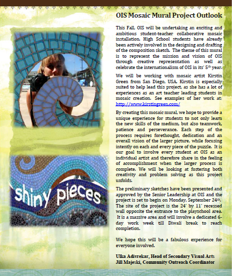 So excited to announce that I will be going to Mumbai this fall for a couple of months to consult on an awesome student driven mosaic mural at an international school. They even wrote something up in their newsletter about the project!