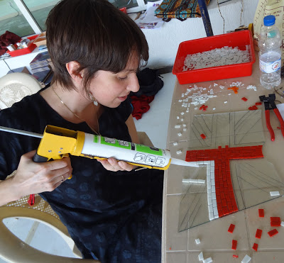 The school I am working in is a high quality private international school. The student body is comprised of kids whose parents can afford to send them there. The facilities are stunning, with a gorgeous swimming pool on the fourth floor, a gym on the seventh, and my mosaic “classroom” occupying a large outdoor space on the fifth. The kids, however privileged, are wonderful, respectful, and sweet. Smart, cute, funny kids, ranging in age from 12 to 19, traipse in and out of the mosaic space throughout the school day, contributing a class time or an hour after school. Although we do plug along, on weekdays, work can go slow and can be difficult. Overall, many of my students lack one crucial mosaicking trait: patience. They are eager to get the thing done, and pay little attention to the finer details such as interstices (grout spaces), andamento (how you set your tesserae (pieces)), and most importantly, glue messes. Plus, they are young, and previously untrained. Even so, they are all improving greatly with each week.