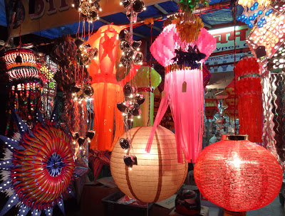 There are awesome lights going up all over the place. I bought a couple of little gems at a local market and am celebrating Diwali in my own small way in my flat each night with my beautiful cloth tulip lamps bedazzled with mirror bits.