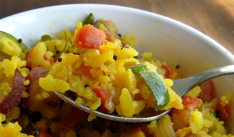 Enough of my self-justifying rambling. Enter poha. This is another Indian convenience food, normally enjoyed for breakfast. Mumbaikers eat this all the time. For all you cats outside of India, you’ll have to take a trip to an Indian market and buy poha, which is precooked, flattened and dry rice. It is a flaky cereal that can easily be reconstituted with a sprinkling of water. It is then seasoned and lightly cooked with a few simple ingredients to create this delicious and quick meal.