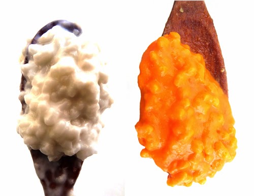 Make the carrot-cumin element. Steam or boil carrots until soft. Puree in blender. In a small pan, heat the coconut oil until it spatters when you drop a single cumin seed in there. Once ready, temper the oil with the remaining cumin seeds, allowing them to pop, toast and spatter for about 15 seconds. Remove from heat, stir into the carrot mixture. Divide the rice porridge in half, and add the carrot cumin mixture. You will now have two flavors of Karelian Pie!