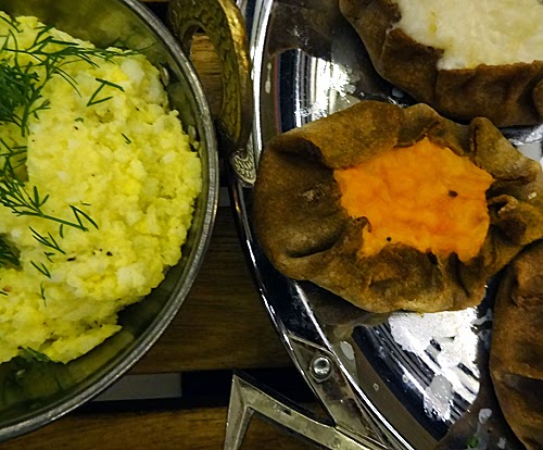 Karelian Pies are typically eaten with egg butter (I love egg butter). It is basically hard boiled eggs mashed up with room temperature butter, and this is the part of the puzzle that I haven’t tackled for the vegans, as I do eat eggs. If you eat eggs but not dairy, like my man, you can make the egg butter with coconut oil and it is just as good as the one made with butter.