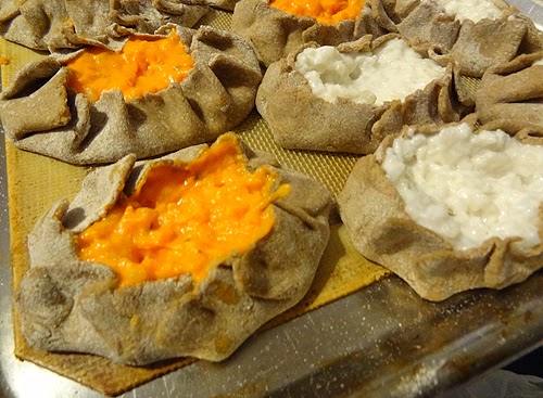 I have broken from tradition here in two ways. In Finland, Karelian Pies are filled with a porridge of milk, salt and short grain rice. The first time I made these, I made two different kinds, one with cow’s milk and one batch with coconut milk. I am not sure why, but it was virtually impossible to tell which one was which. This is good news for vegans and people avoiding dairy. The other liberty I took was to stir boiled, pureed carrots and a bit of oil tempered with cumin seeds in to half of the finished rice porridge before stuffing the pastries. This resulted in a creamy, slightly sweet cumin laced pie, which I have to say I like even more than the original. One thing I have learned about Karelian Pies: the flavor must be simple and pure so as not to overpower the subtle flavor of the rye flour crust.