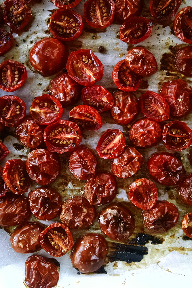 Roast the tomatoes. Preheat the oven to 350F. Line a baking sheet with parchment paper, arrange the tomatoes in one layer, drizzle with olive oil and sprinkle with salt & black pepper. Roast for about one hour, until the tomatoes are shriveled and reduced in size. This technique is great for bringing out natural sweetness and flavor in even a mediocre tomato. When done, remove from oven and set aside..
