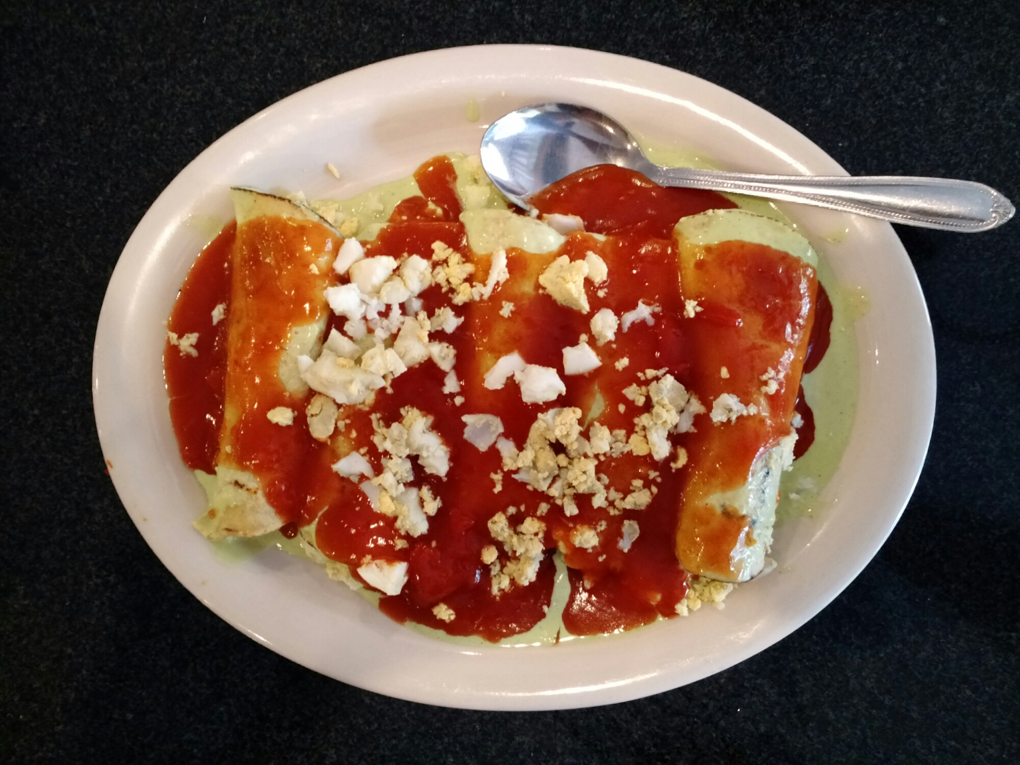 We have enjoyed papadzules, which are like enchiladas, filled with hard boiled eggs and topped with two sauces: a tomato sauce and a pepita/epazote sauce. I’ll post a recipe, veganized of course, when I get home. There are Panuchos, which are fried discs of masa stuffed with beans and served with chopped cabbage, salsa, and avocados. We’ve had quesadillas with huitlacoche (corn fungus) and tamales with chaya (a green leaf kinda like spinach). All delicious. The Yucatecan salsa is made with charred hot green peppers and a sour orange juice which I really want to replicate at home.