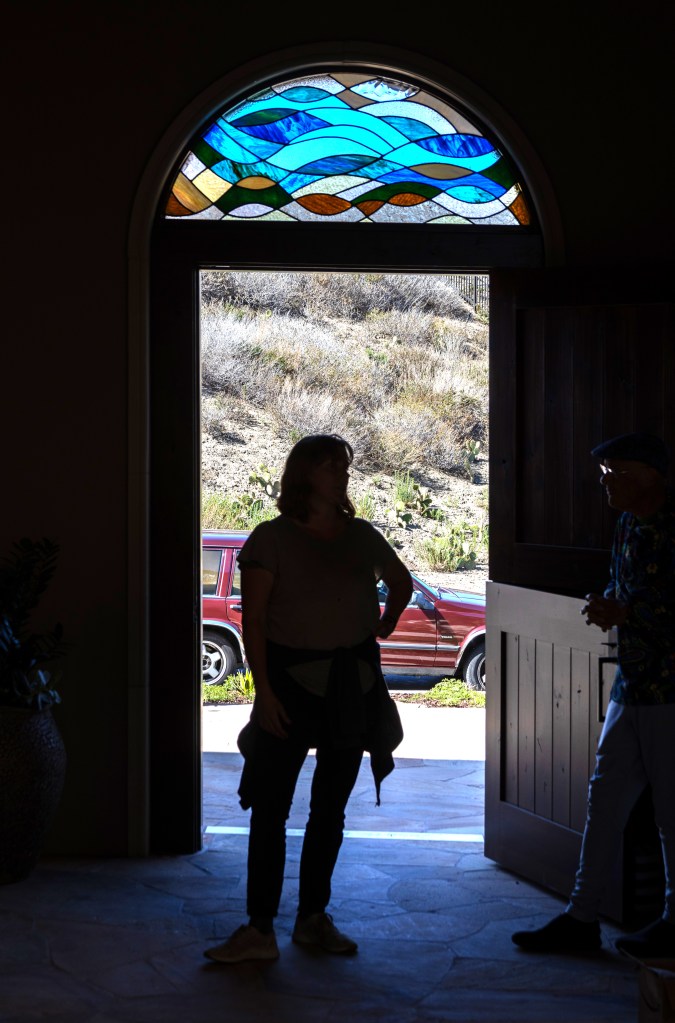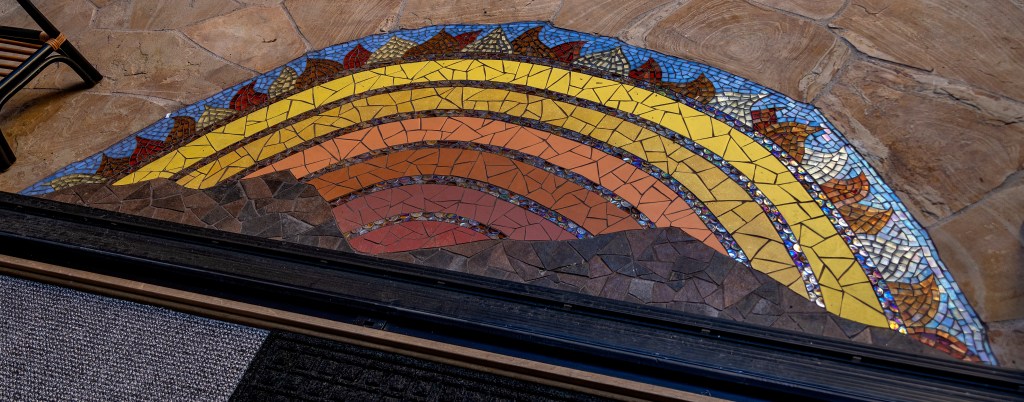 This is a stained glass window over the front entry to the residence. It evokes water and tides.