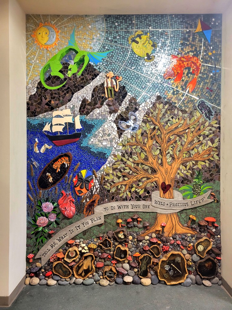 This is a collaborative mural created with high school students before, during and after The Great Pause (otherwise known as the Covid 19 Pandemic). A multimedia labor of love, this mural references 40 novels and is an homage to perseverance, creativity, literature and imagination.
