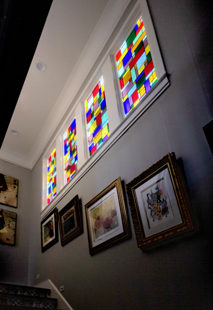 The client wanted stained glass windows, and I looked to Mondrian to create light that would be evocative of a holy space. Each window is 2 by 5 feet.